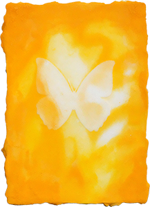 片山雅史はこれまで、そのキャリアの中で常に新しい表現を求め、作品も変遷を遂げてきました。「植物態」「風」「皮膜」「HANA」「螺旋」「メメントモリ」一貫してあるのは目に見えない絶対的な何かに繋がる感覚、五感を超えた第六感までもが刺激される様な感覚です。23年前に拠点を福岡に移し、それまでのモノクロ主体の作品から黄色を主として描き始めた皮膜シリーズ、黄色は生命に降り注ぐ光であり花粉の色でもあります。そこに描かれる向日葵の花芯部の螺旋模様は、自然界のすべての生命の営みをたたえるかのようです。HANAシリーズで描かれている繊細かつ優美なフォルムは、いのちの輝きであると同時に儚さをも宿しています。そして、生と死をみつめる無数の蝶が舞うメメントモリ。